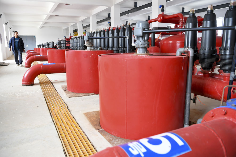 工作人員在寧夏吳忠市利通區高閘鎮高效節灌蓄水池泵房查看設備運行情況(5月24日攝)。新華社記者 馮開(kāi)華 攝