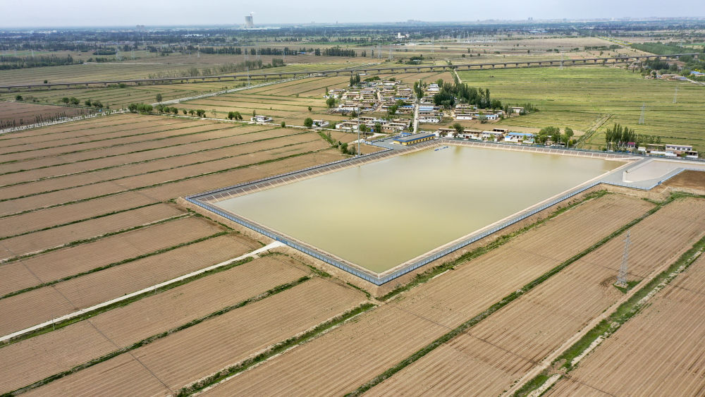 寧夏吳忠市利通區高閘鎮高效節灌蓄水池(無(wú)人機照片,5月24日攝)。新華社記者 馮開(kāi)華 攝