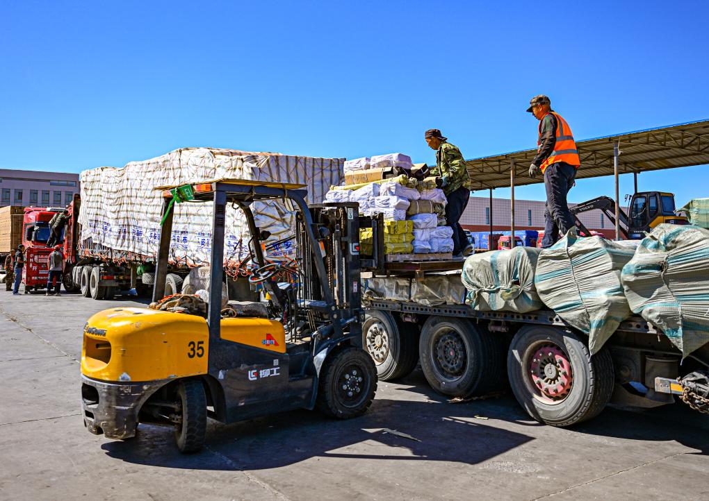 2023年6月11日,工人在二連浩特口岸旁的進(jìn)出口物流園區中裝載準備出口的貨物。新華社記者 彭源 攝