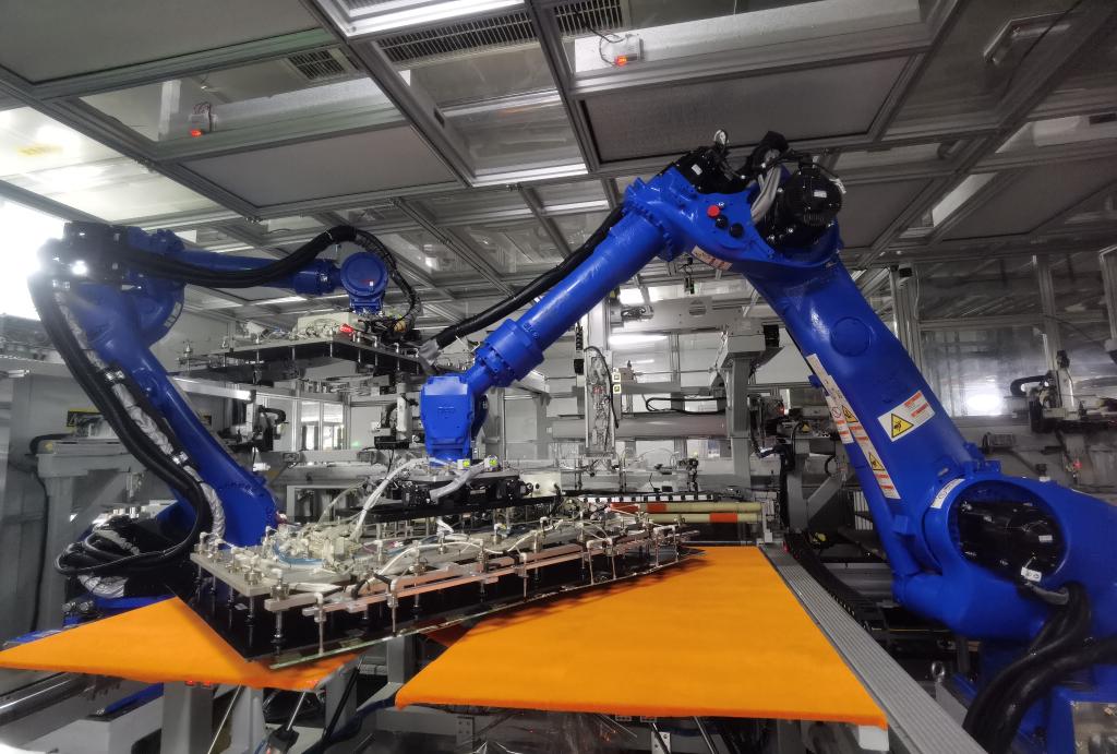 在位于青島的海信視像智能車(chē)間生產(chǎn)線(xiàn)上,機器人對液晶面板和背光板自動(dòng)化精準卡合(6月19日攝)。新華社記者王凱 攝