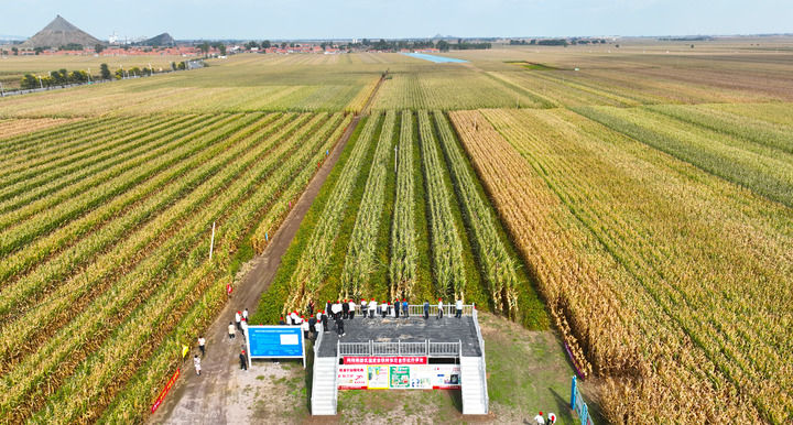 在遼寧省鐵嶺縣蔡牛鎮,外地農民到張莊玉米合作社的大田里學(xué)習玉米選種和栽種技術(shù)(2023年9月26日攝,無(wú)人機照片)。新華社記者 楊青 攝