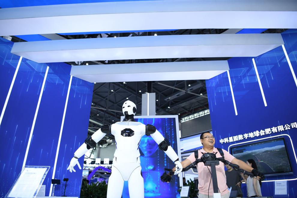 9月20日,在2023世界制造業(yè)大會(huì )上,觀(guān)眾在體驗一款VR遠程抓取機器人。新華社記者張端 攝