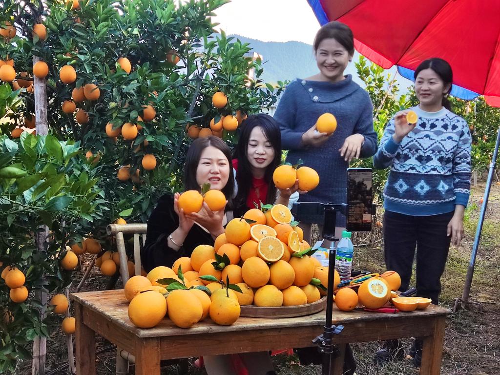 “身后是我自己家的臍橙園,保證您的橙子都是新鮮采摘、當天發(fā)貨?!毙咆S縣果農殷春梅對著(zhù)手機正向觀(guān)眾直播。