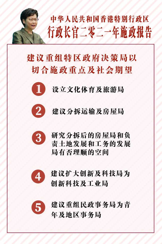 為提升管治迎接新挑戰,林鄭月娥就重組特區政府決策局提出建議。她建議重組可采納以下方向:設立文化體育及旅游局,推進(jìn)香港發(fā)展成為中外文化藝術(shù)交流中心;建議分拆運輸及房屋局,讓這兩大政策范疇可獲得更專(zhuān)注的高層領(lǐng)導;建議擴大創(chuàng )新及科技局為創(chuàng )新科技及工業(yè)局,改變香港“工業(yè)式微”的觀(guān)感;建議重組民政事務(wù)局為青年及地區事務(wù)局,加強解決地區問(wèn)題及支持青年發(fā)展。