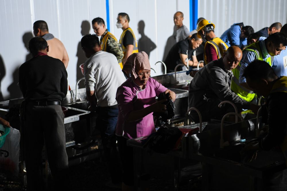 轉而連降暴雨,氣溫急轉直下,雨水和黃土和成泥漿灌進(jìn)工人生活區的帳篷,行軍床和被褥漂在泥水里,但為了搶工期,建設者們仍在雨中夜以繼日奮戰。