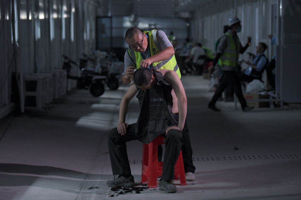 3月17日晚上,借著(zhù)一點(diǎn)燈光,建設者互相幫忙理發(fā)。