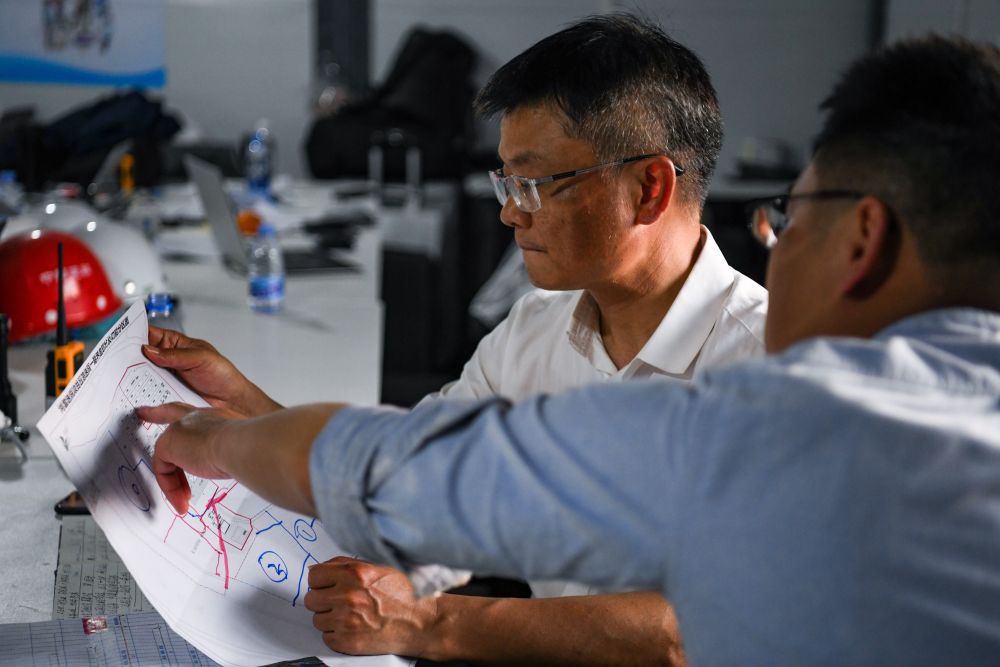 這是中建科工分管生產(chǎn)的副總經(jīng)理方春生(左),烈日在他臉上曬出口罩的痕跡(3月10日攝)。