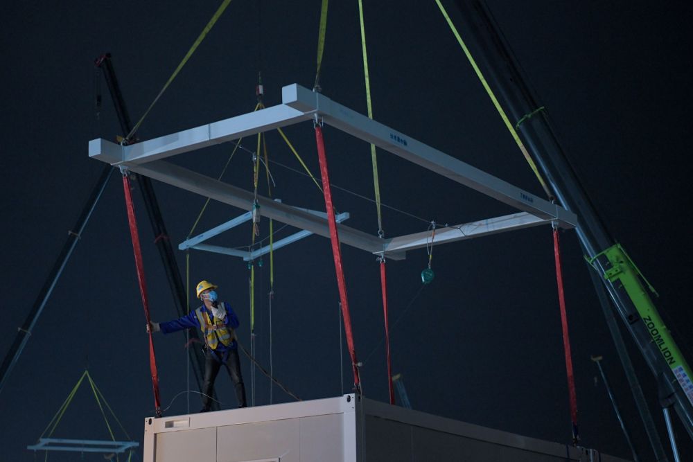 3月20日夜晚,一名工人在中央援港應急醫院建設現場(chǎng)進(jìn)行吊裝作業(yè)。