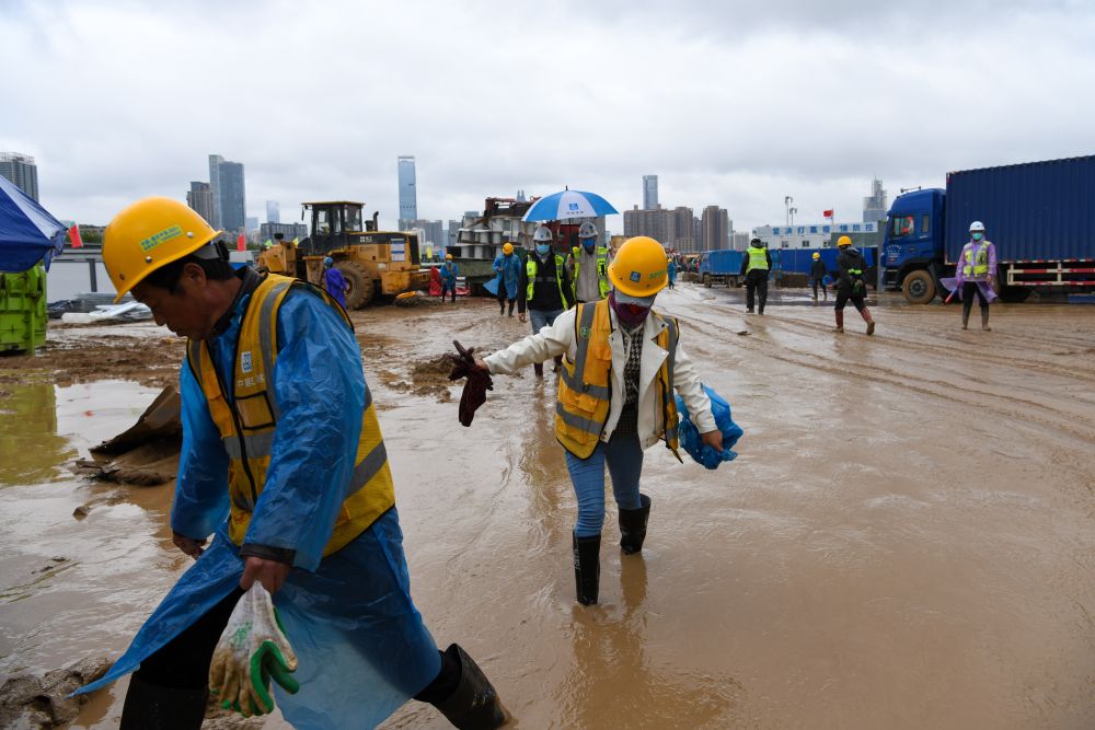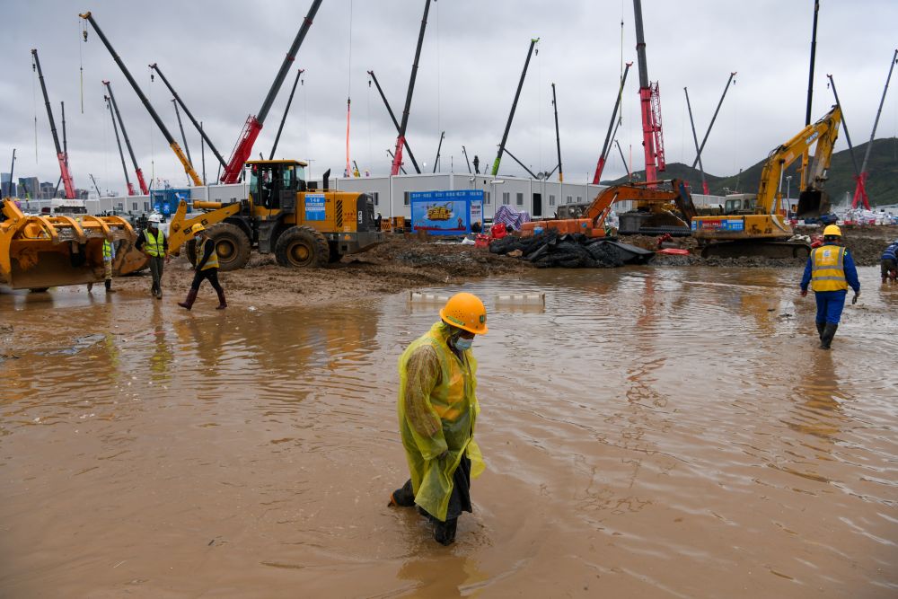 3月24日,連日陰雨,建設者們在工地上艱難行走。