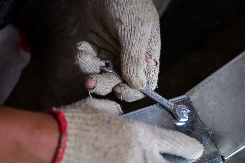 3月27日,工人正在擰緊一顆螺絲,戴著(zhù)的一雙勞保手套上有多處破洞。