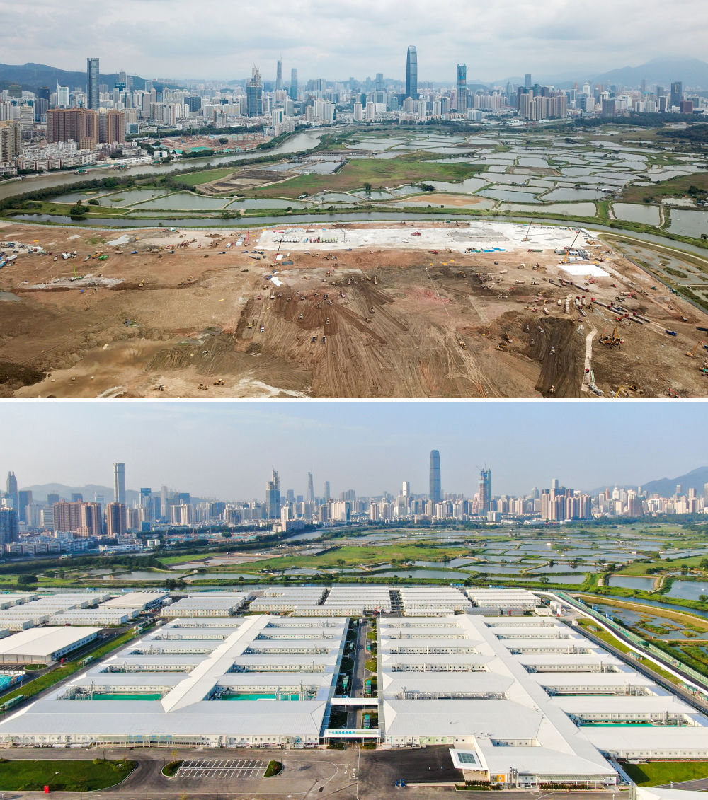 這是中央援港應急醫院和落馬洲方艙設施項目完工前后對比照片(上圖拍攝于3月6日,下圖拍攝于5月5日)。