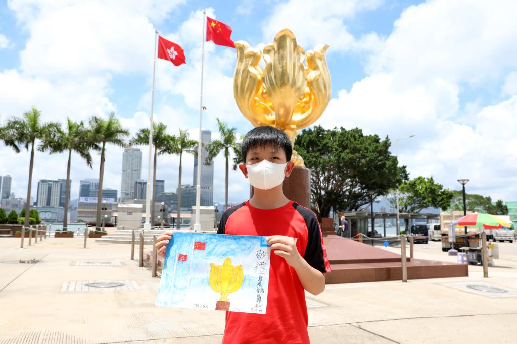 香港小學(xué)生曾祥珂帶著(zhù)自己的畫(huà)作《敬禮——慶祝香港回歸25周年》,在父母陪伴下來(lái)到金紫荊廣場(chǎng)留影,迎接香港回歸25周年。新華社記者 吳曉初 攝