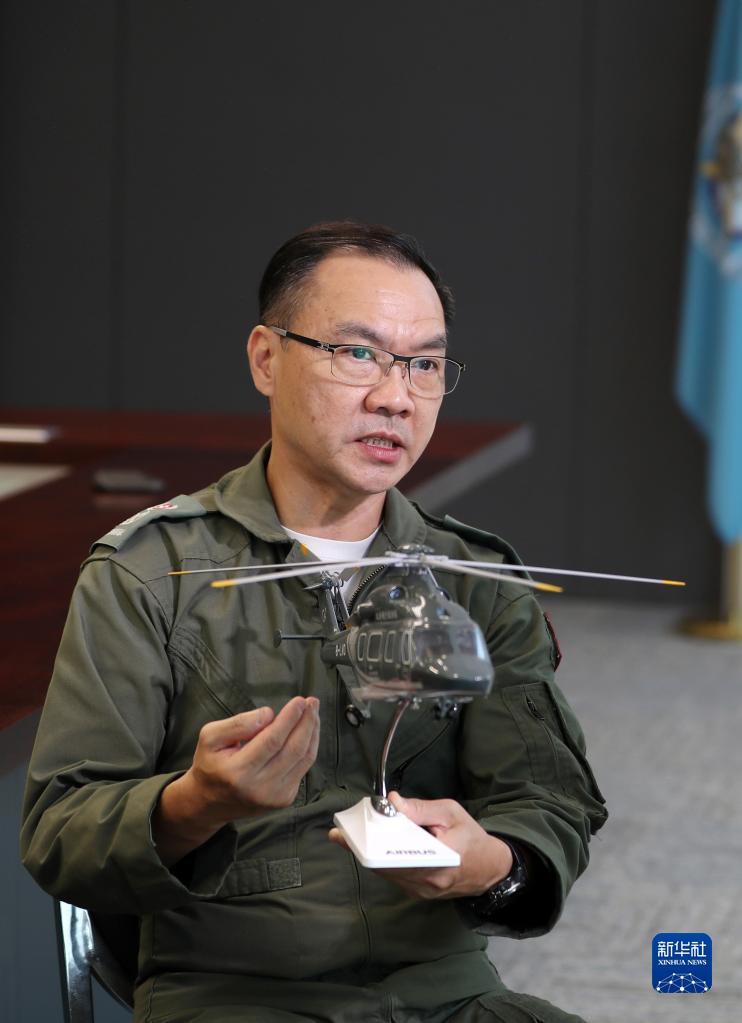香港特區政府飛行服務(wù)隊總監胡偉雄接受記者采訪(fǎng)(6月20日攝)。新華社記者 李鋼 攝