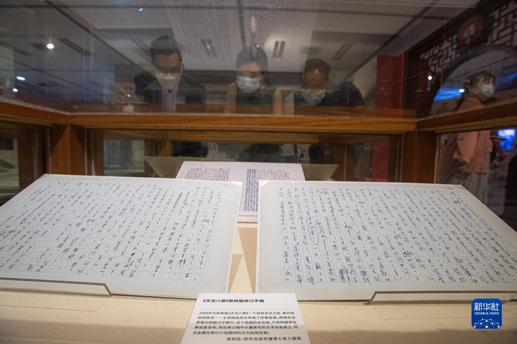 9月9日,參觀(guān)者觀(guān)看展出的《天龍八部》新修版修訂手稿。新華社記者 肖藝九 攝
