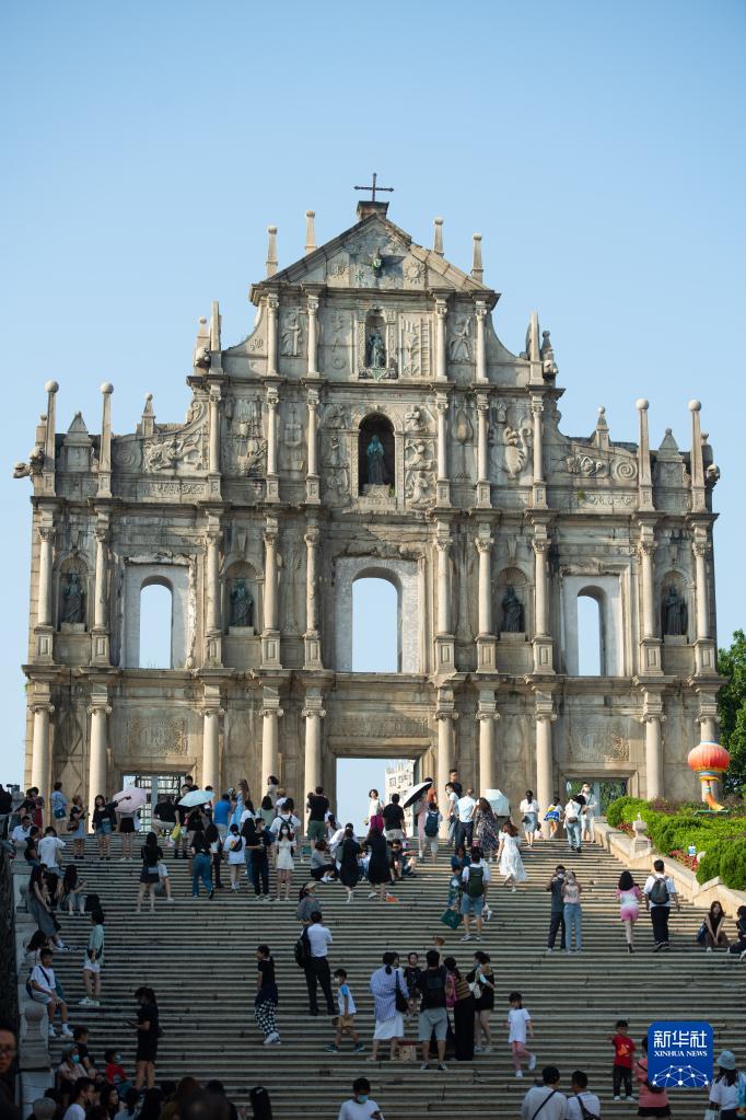 10月4日,游客在澳門(mén)大三巴牌坊前游覽。新華社記者 張金加 攝
