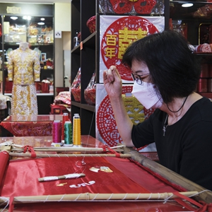 走進(jìn)老店位于九龍街頭的店鋪,宛如走進(jìn)一個(gè)小型婚慶用品博物館。衣架上掛著(zhù)各式新娘裙褂、新郎馬褂、旗袍等,櫥窗里有繡花鞋、龍鳳掛件、新娘傘等配飾,還有枕頭、坐墊等婚嫁用品陳列,墻上貼著(zhù)大紅的喜字。