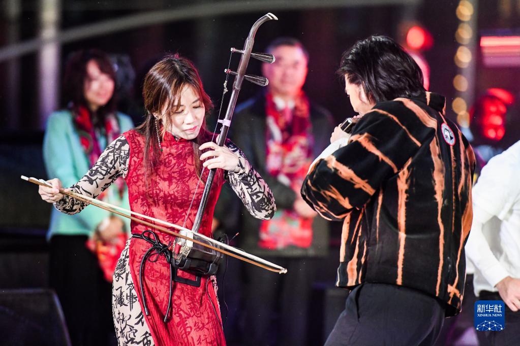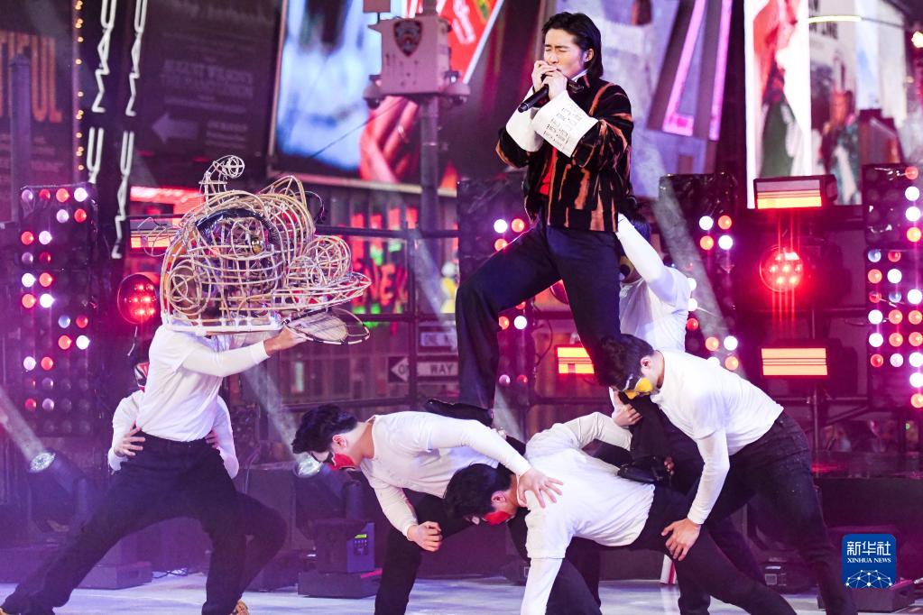 2022年12月31日,在美國紐約時(shí)報廣場(chǎng),來(lái)自中國香港的藝術(shù)家在跨年倒計時(shí)活動(dòng)上表演。新華社發(fā)(朱子于攝)