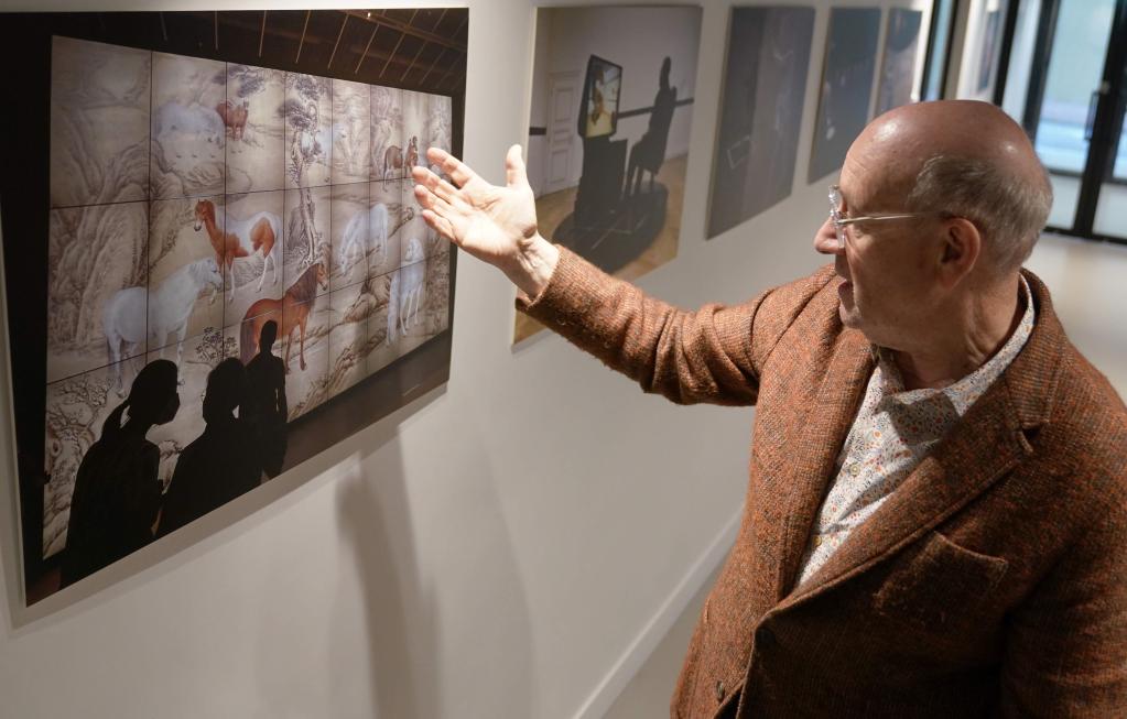 在香港浸會(huì )大學(xué)視覺(jué)化研究中心,香港浸會(huì )大學(xué)視覺(jué)藝術(shù)院講座教授、藝術(shù)家邵志飛在自己的作品前駐足(5月11日攝)。新華社記者 王申 攝