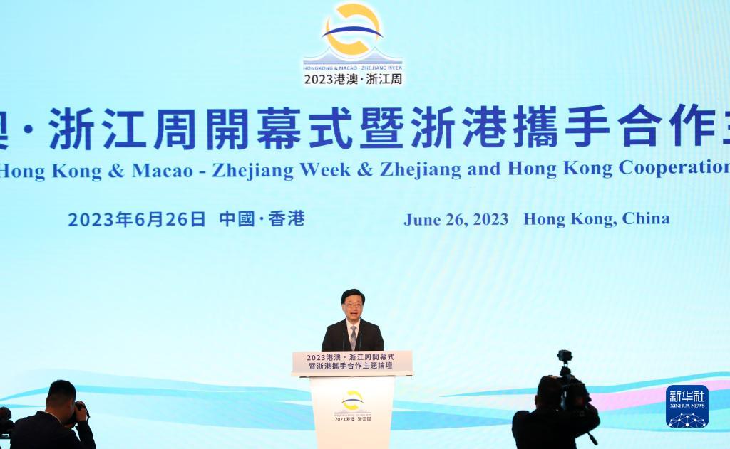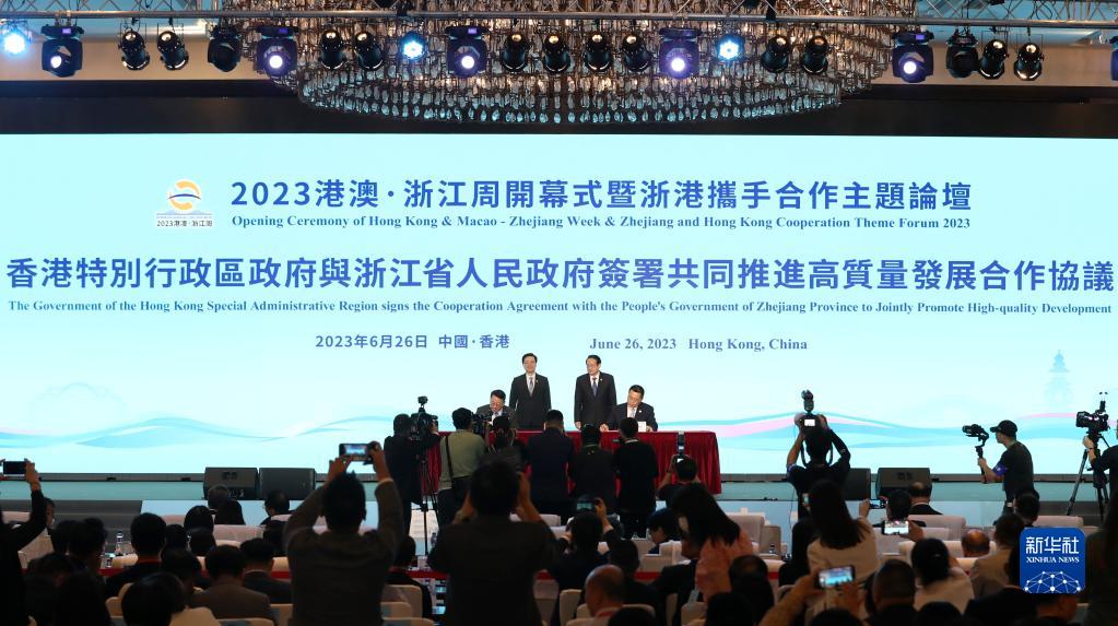 6月26日,2023港澳·浙江周開(kāi)幕式暨浙港攜手合作主題論壇在香港舉行。浙港雙方現場(chǎng)簽署共同推進(jìn)高質(zhì)量發(fā)展合作協(xié)議以及3項合作備忘錄,同時(shí)簽約多個(gè)合作項目,涉及高端制造、信息技術(shù)、教育科技等領(lǐng)域。新華社記者 李鋼 攝