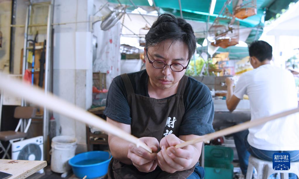 7月27日,徒弟郭達麟在維修雀籠。新華社記者 陳鐸 攝