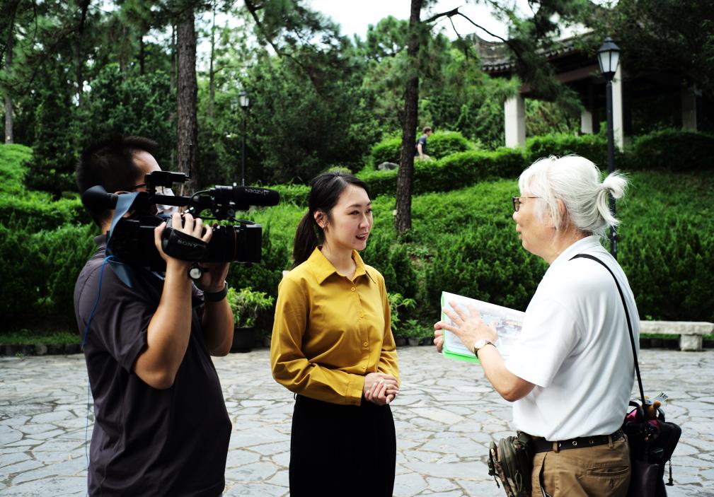 在九龍寨城公園,“波叔”吳力波(右)接受記者訪(fǎng)問(wèn)。新華社記者 李鋼 攝