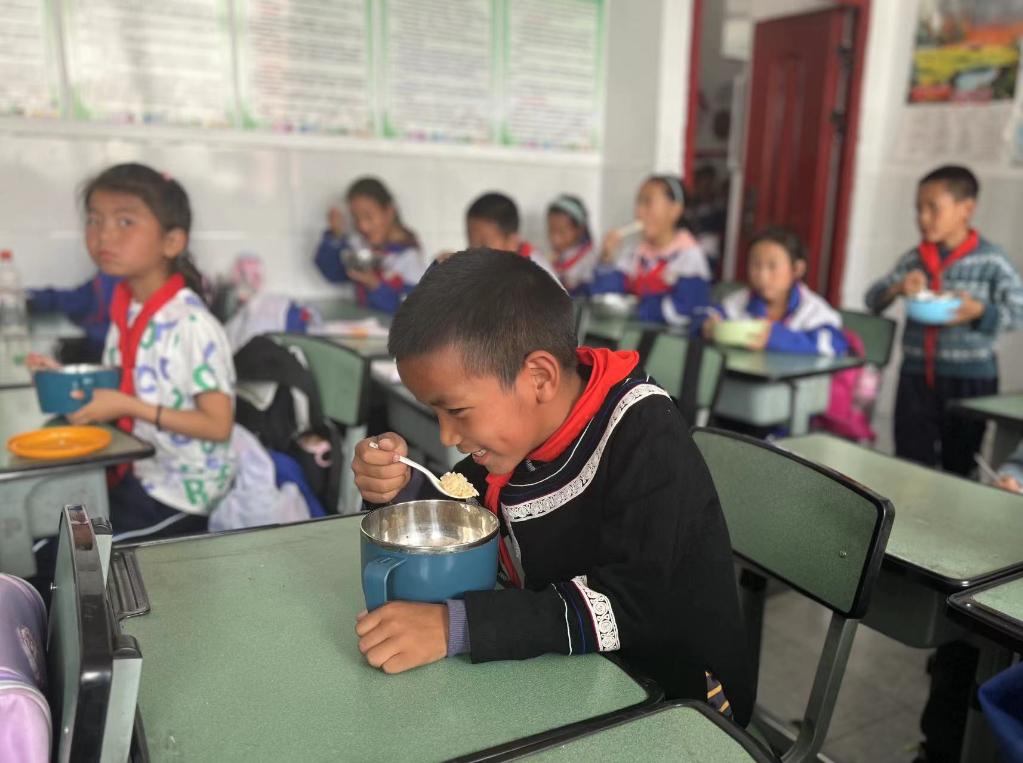 5月18日中午,四川省涼山彝族自治州越西縣文星小學(xué)校二年級學(xué)生在學(xué)校吃午飯?!⌒氯A社記者吳曉穎 攝