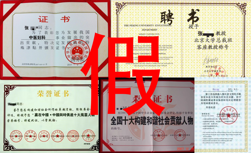 記者在警方展示的證據中看到,嫌疑人張某還偽造大量證書(shū)、虛構眾多頭銜騙取信任,如中醫婦科領(lǐng)域“權威專(zhuān)家證書(shū)”、“贏(yíng)在中國·中國與時(shí)俱進(jìn)十大風(fēng)云人物”榮譽(yù)證書(shū)、“政府特殊津貼”證書(shū)、“北京大學(xué)總裁班客座教授”聘書(shū)等等。