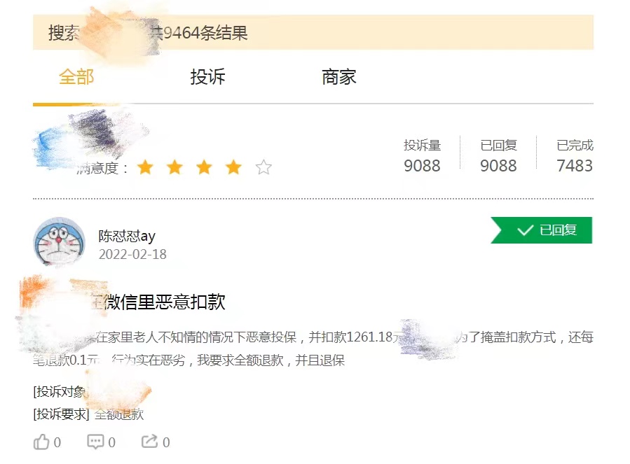 記者發(fā)現,在“黑貓投訴”平臺,該網(wǎng)絡(luò )保險平臺迄今已有9000多條投訴,“老人在不明白的情況下被誤導投?!钡瘸蔀槌R?jiàn)的投訴標題。