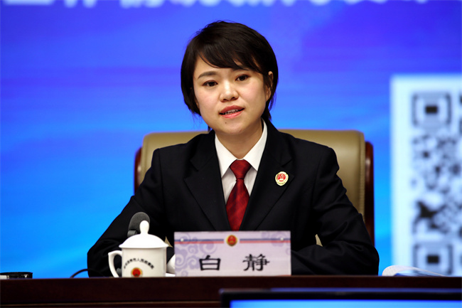 白靜在新聞發(fā)布會(huì )上介紹呼和浩特市檢察院公益訴訟檢察工作。