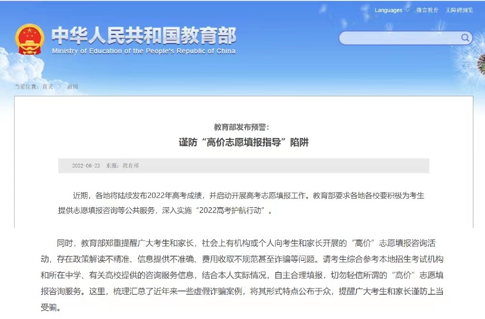 近日,教育部發(fā)布預警,提醒考生謹防“高價(jià)志愿填報指導”陷阱。有網(wǎng)站虛假宣傳擁有所謂“內部信息”,自稱(chēng)掌握內部大數據,能夠“精準定位院?!钡鹊?。事實(shí)上,每年高考填報志愿前,各省級招生考試機構都會(huì )發(fā)布當年高考成績(jì)統計情況和近年來(lái)各高校錄取分數情況,并不存在市面上的咨詢(xún)機構或個(gè)人聲稱(chēng)的“內部信息”。還有一些咨詢(xún)機構假冒所謂志愿填報專(zhuān)家身份。該咨詢(xún)機構打出廣告,稱(chēng)團隊的專(zhuān)家“獲得高考志愿規劃師認證”“來(lái)自著(zhù)名高?!钡?。事實(shí)上,有關(guān)部門(mén)從未發(fā)放過(guò)“高考志愿規劃師”這類(lèi)職業(yè)資格證書(shū)。該機構一些所謂“志愿規劃師”都是臨時(shí)招募的社會(huì )人員,按照總部提供的“臺詞”給考生和家長(cháng)輔導。家長(cháng)購買(mǎi)這些機構的服務(wù)不僅花了冤枉錢(qián),而且可能報錯志愿。