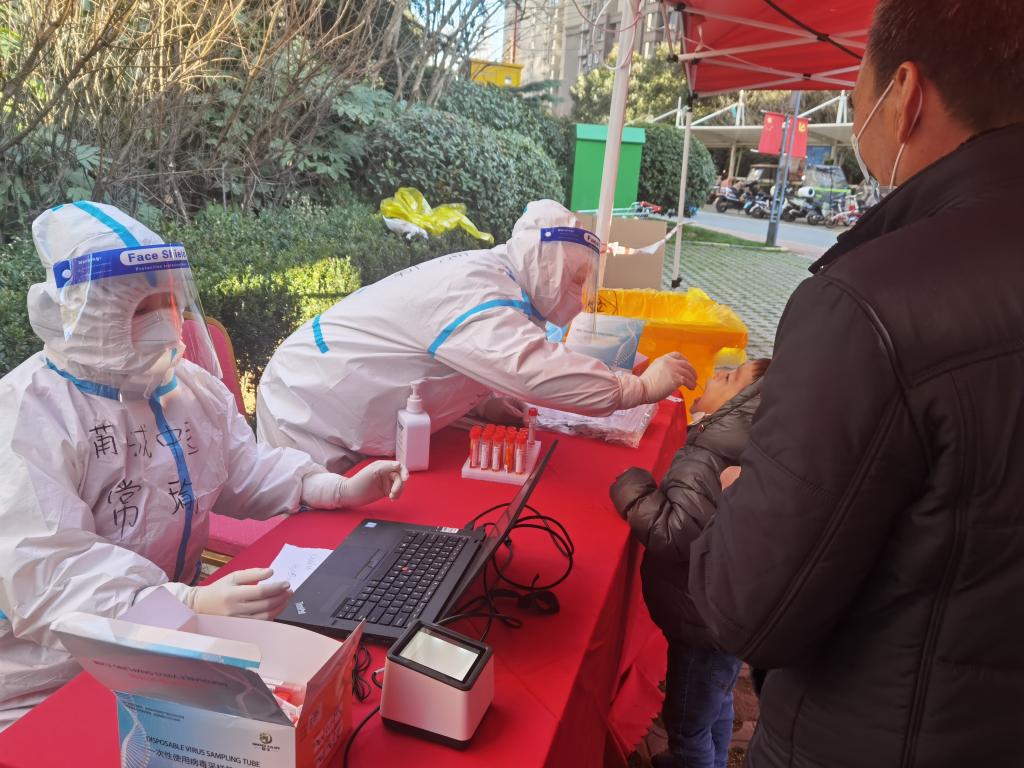 陜西省蒲城縣核酸采樣支援隊隊長(cháng)常瑜在西安一社區內為居民做核酸檢測。(受訪(fǎng)者供圖)