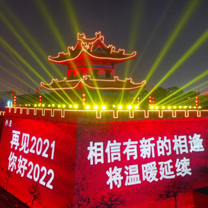 新年的鐘聲剛剛敲響,一束光影打在西安古城墻上,映出幾行字跡。