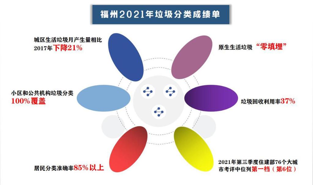 2021年,福州市城區生活垃圾月產(chǎn)生量相比2017年下降21%,小區和公共機構分類(lèi)全覆蓋,居民分類(lèi)準確率85%以上,后端分類(lèi)處置體系完備,回收利用率達37%,分類(lèi)和減量化成效顯著(zhù),在2021年第三季度住建部76個(gè)大城市考評中位列第一檔(第6位),垃圾分類(lèi)成為福州市民綠色生活新風(fēng)尚。