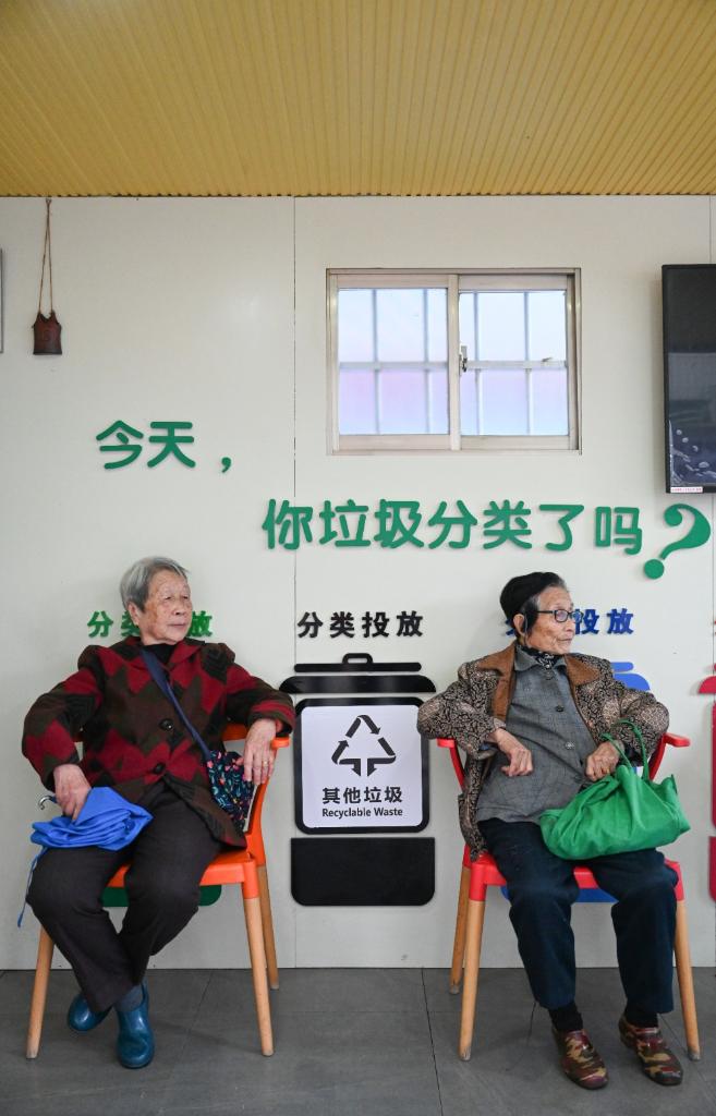 2022年1月23日,兩位老人在福建省福州市鼓樓區灰爐新苑的垃圾分類(lèi)宣教室內休閑。新華社記者 周義 攝