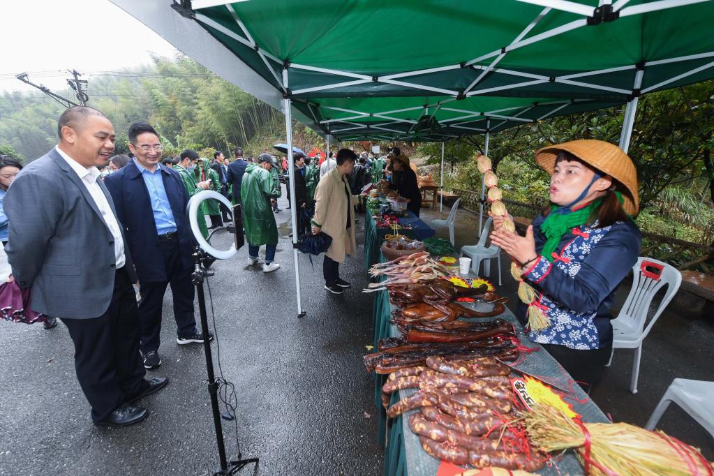 2021年11月6日,一場(chǎng)以“同心薈·助共富”為主題的未來(lái)鄉村社區主題論壇在浙江省杭州市臨安區錦南街道橫嶺村舉行。圖為參加活動(dòng)的新鄉賢代表在參觀(guān)橫嶺村的農特產(chǎn)品展示。新華社記者徐昱 攝