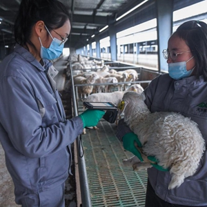 2022年1月6日,浙江省湖州市長(cháng)興縣呂山鄉湖羊智慧循環(huán)產(chǎn)業(yè)園的工作人員在掃描湖羊幼仔耳朵上的數字芯片。新華社記者徐昱 攝