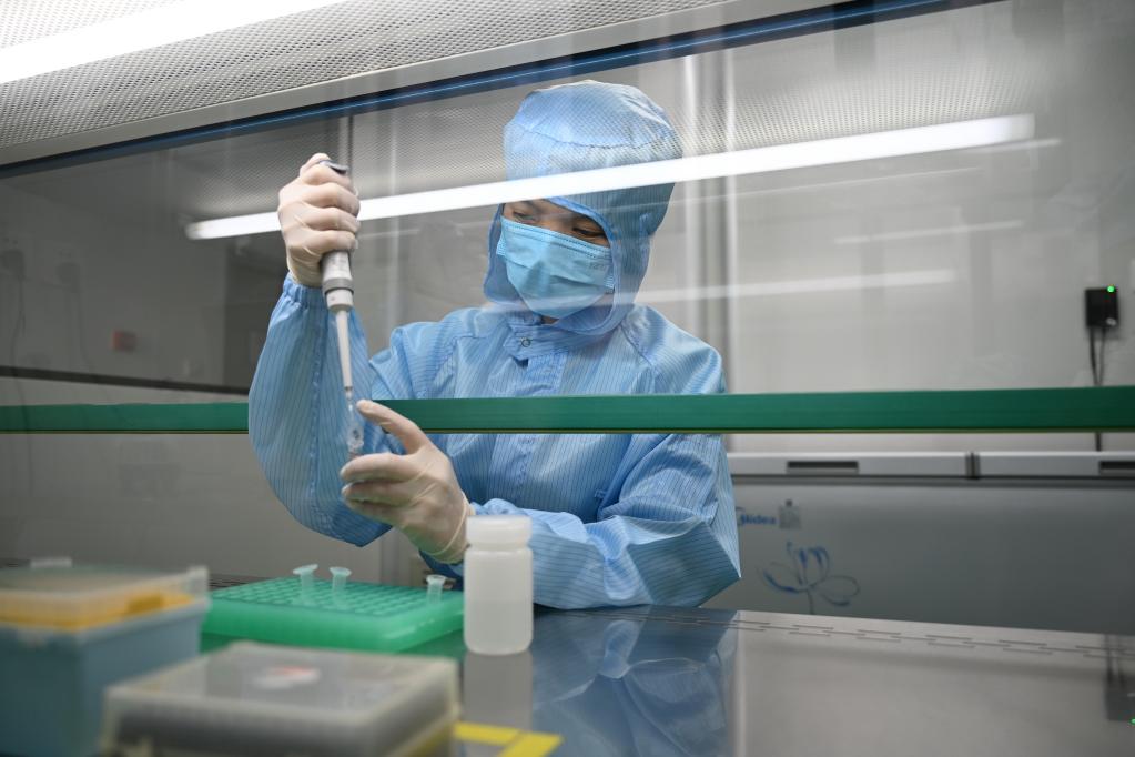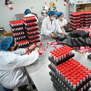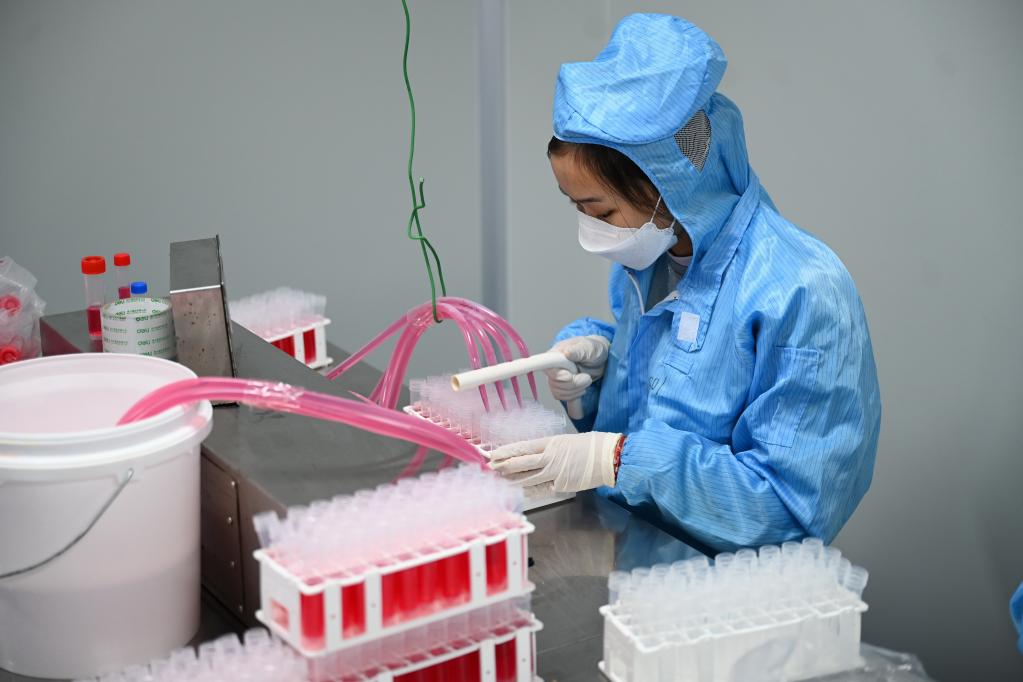 3月16日,美林美邦(廈門(mén))生物科技有限公司員工在分裝滅活型病毒保存液。 新華記者 林善傳 攝