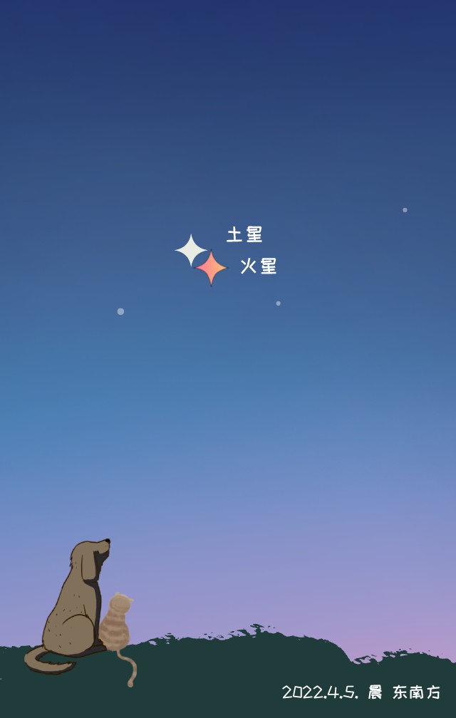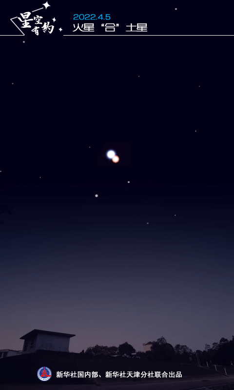 天津市天文學(xué)會(huì )理事、天文科普專(zhuān)家修立鵬介紹,4月5日凌晨6時(shí)5分,火星“合”土星,土星在上,火星在下。此次“相合”二者距離極近,最近時(shí)角距離僅有20角分,相當于滿(mǎn)月視直徑的三分之二,堪稱(chēng)“親密無(wú)間”。