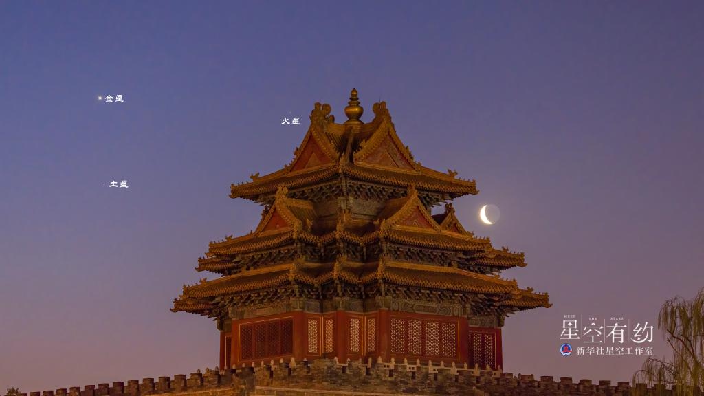 這是北京市天文愛(ài)好者吳魯萍2022年3月28日清晨在北京拍制的金星、火星、土星與殘月。(本人供圖)