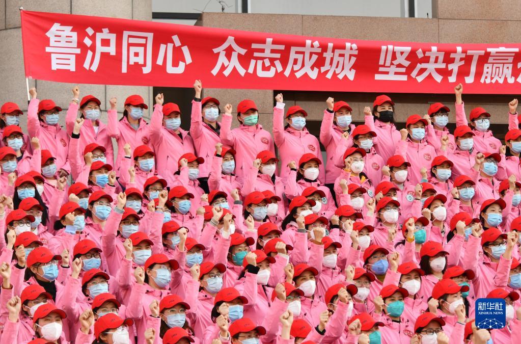 4月3日,第一批山東省援滬醫療隊隊員在濟南市參加出征儀式。新華社記者 徐速繪 攝