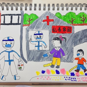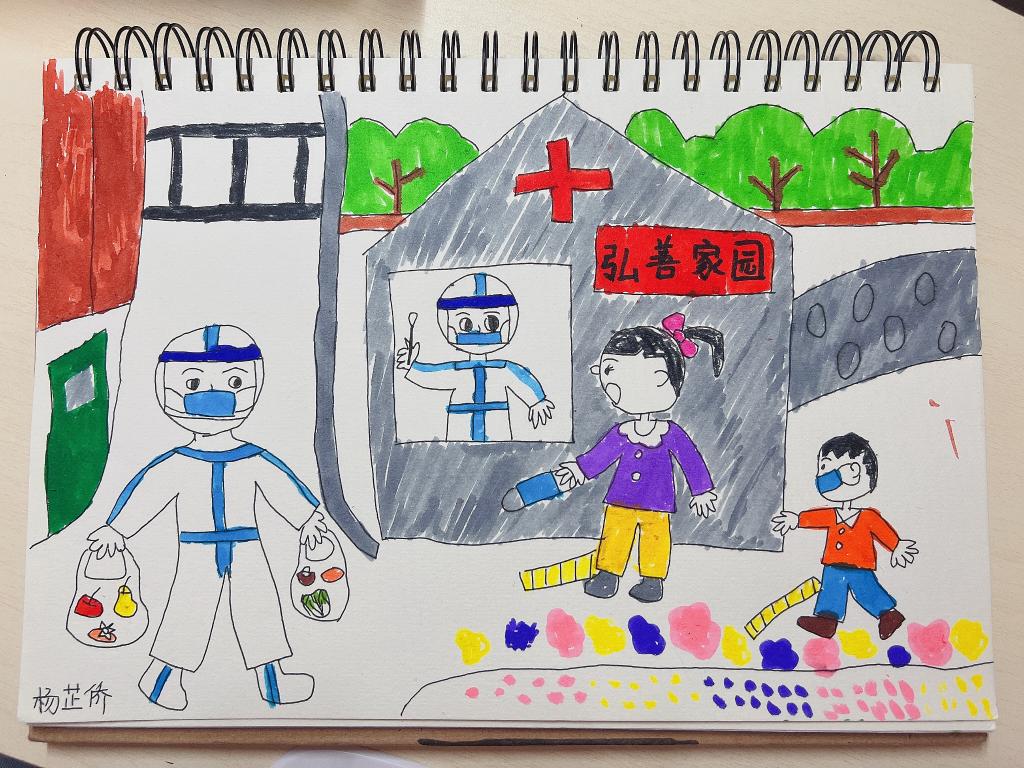 北京市東城區光明幼兒園朝陽(yáng)分園的幼兒創(chuàng )作的繪畫(huà)作品《戰疫情》。(受訪(fǎng)者供圖)