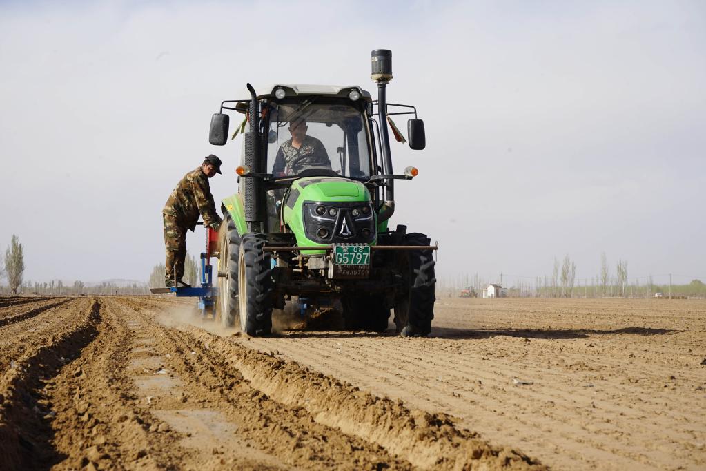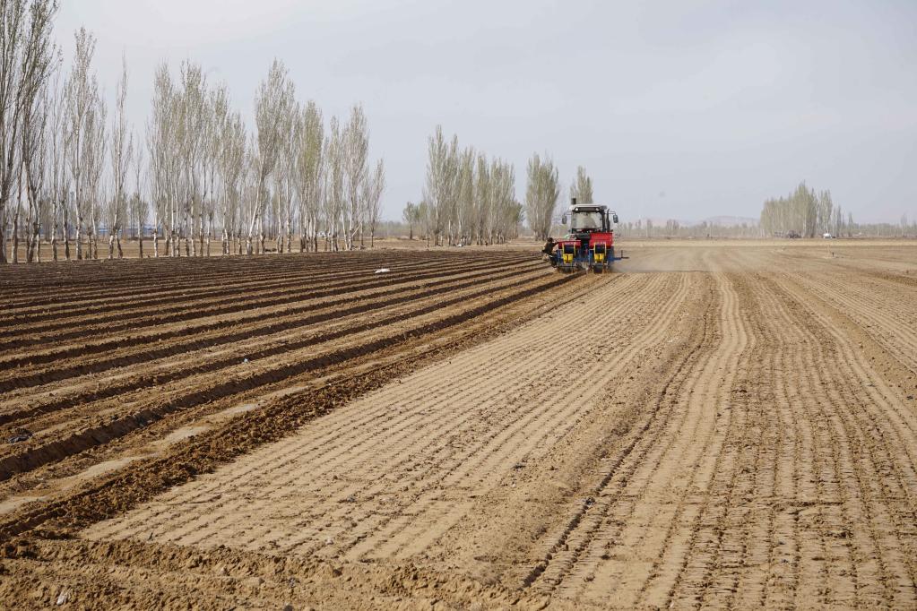 4月12日,農機合作社的工作人員正在耕種烏拉特前旗蘇獨侖鎮的托管土地。 新華社記者侯維軼 攝