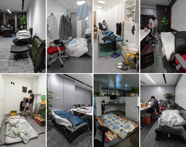 ↑這是記者在封閉管理期間拍攝的工商銀行上海分行金融市場(chǎng)部堅守崗位的部分員工的住處。員工們將會(huì )議室、更衣間臨時(shí)改成單人宿舍用于休息(拼版照片,4月14日攝)。