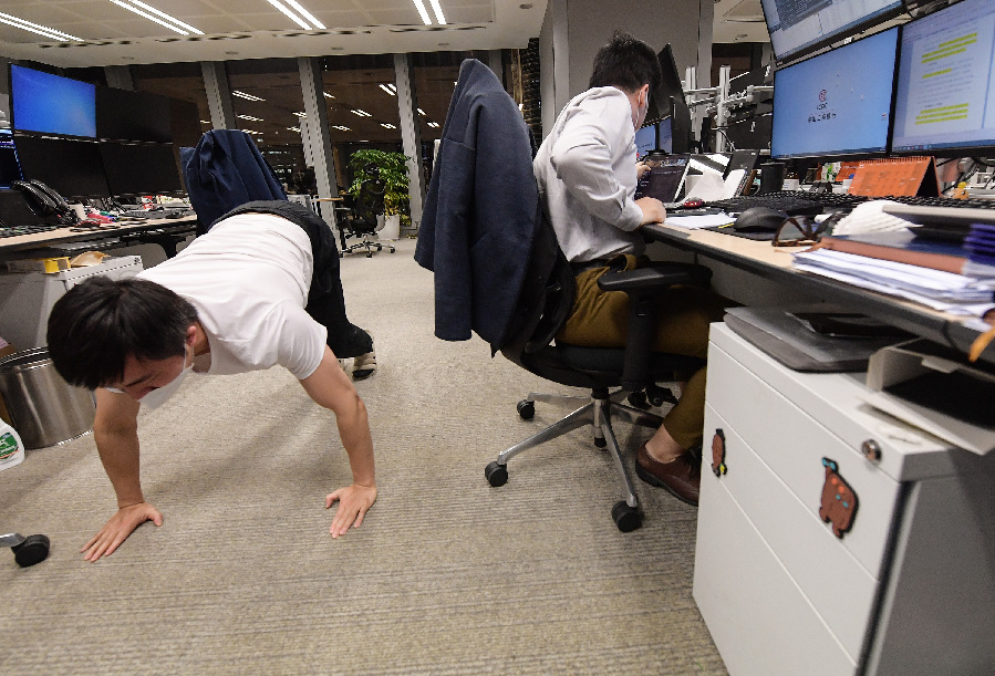 ↑4月14日,工商銀行上海分行金融市場(chǎng)部市場(chǎng)營(yíng)銷(xiāo)科科長(cháng)黃碩喆(左)在空閑時(shí)做起了俯臥撐。