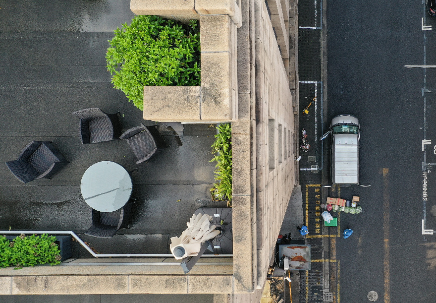 ↑4月21日,在后勤服務(wù)小組指揮下,工作人員在位于上海外灘的中國銀行上海市分行營(yíng)業(yè)部入口處對配送的生活物資進(jìn)行消殺。