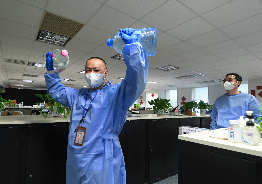 ↑后勤保障小組成員薛鋒以5升裝的桶裝水作為自己鍛煉的“器械”(4月20日攝)。