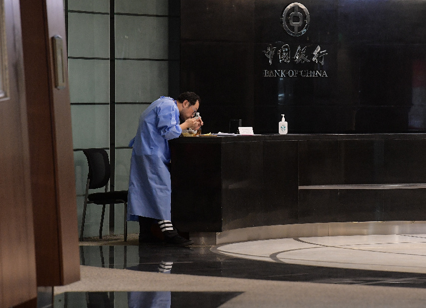 ↑中國銀行上海市分行后勤服務(wù)中心主管韓皓在大樓內一處空曠的位置吃午飯(4月20日攝)。
