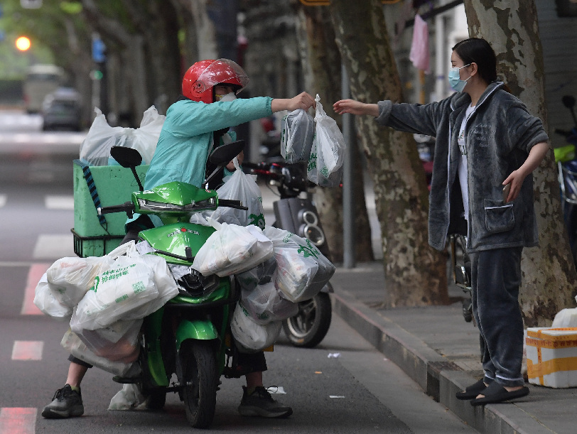 ↑一位快遞小哥在上海市黃浦區興安路為居民送貨(4月28日攝)。