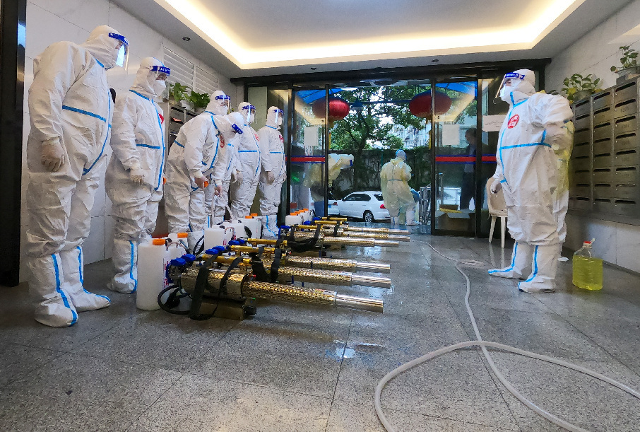 ↑4月13日,馳援上海的蘭州山河救援志愿服務(wù)隊來(lái)到黃浦區疫情嚴重的多個(gè)小區,對居民樓進(jìn)行消殺。