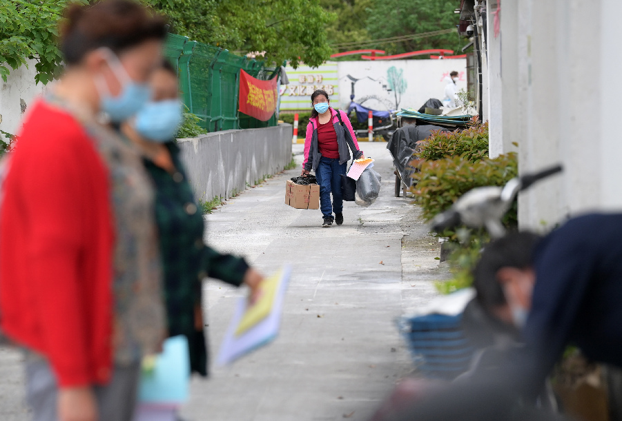 ↑4月24日,由方艙醫院返回的村民王女士走入村中家門(mén)口的小路。當日起,上海市浦東新區北蔡鎮聯(lián)勤村村民陸續從隔離點(diǎn)回家。